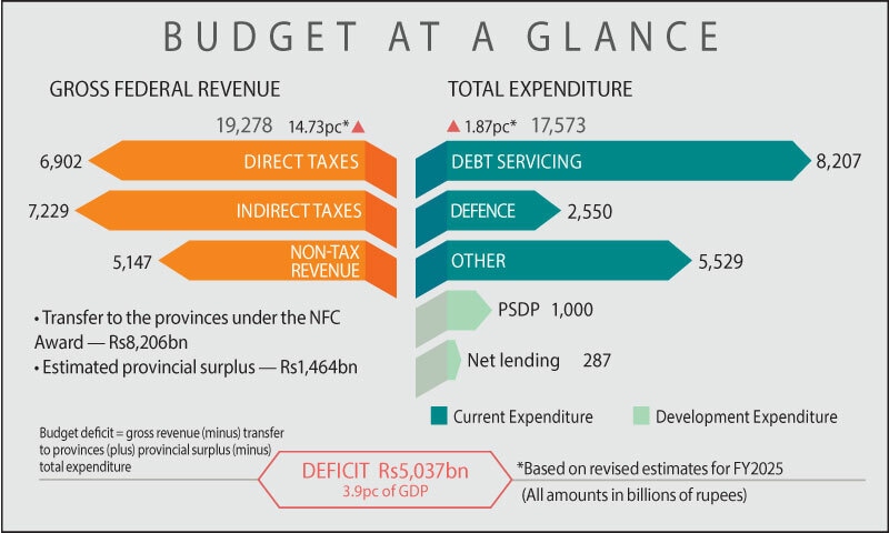 As someone who has tracked Pakistan’s budgets for years, the federal government’s announcement this Tuesday for the fiscal year 2025-26 reflects a bold yet calculated attempt to balance growth with stability. With a total budget outlay of Rs18.9 trillion (a 7% increase from the outgoing FY25), the government is targeting a GDP growth of 4.2% while managing inflation at 7.5%. Sector-wise, projected growth includes 4.5% for agriculture, 4.3% for industrial, and 4% for services. The budgeted deficit is pegged at 3.9%, with a primary surplus of 2.4%, showing a fiscal tightening approach. The FBR has been given a steep revenue target of Rs14.13 trillion, with an 18.7% increase YoY, while non-tax receipts are projected at Rs5.15 trillion. Major expenditures include Rs8.207 trillion in interest expense, Rs1.3 trillion for PSDP, Rs2.55 trillion for defence, and Rs1.05 trillion for pensions, with Rs1.19 trillion earmarked for subsidies. Social programs like BISP see a 21% boost to Rs716 billion, while Higher Education and science & technology get Rs39.5 billion and Rs4.8 billion, respectively.