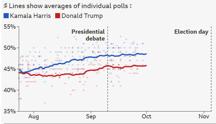 The recent televised debate on 10 September in Pennsylvania between Harris and Trump drew an impressive audience, with just over 67 million people tuned in to watch the two candidates go head to head. Following the debate, national polls showed a marginal boost for Harris, who gained about 2.5 percentage points, while Trump’s numbers fell by half a percentage point in the week that followed. Although Harris’s performance helped her slightly increase her lead, the poll tracker indicates that changes in the averages were mostly small, with many viewers still assessing the candidates’ overall performances and trends. As the election draws closer, the competition remains tight, and each debate will likely continue to influence voter opinions as they track the shifting trend lines in the polls.
